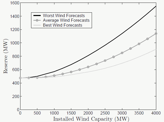 Зависимость потребности в резервных мощностях от точности прогноза ветра