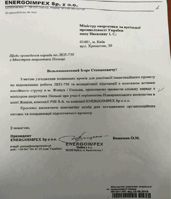 Есть и менее известные фирмы, готовые поучаствовать в проекте. Речь идет о польской компании "Энергоимпэкс" (Energoimpex). Фирма отличается хорошей информированностью, настойчивостью и отсутствием комплексов. Ее директор Александр Ващенко 23 мая 2016 г. пишет письмо министру энергетики и угольной промышленности Игорю Насалику с предложением, ни много ни мало, провести встречу по проекту с участием министра энергетики Польши, руководства Подкарпатского воеводства и польского системного оператора PSE. Таким нехитрым способом фирма с уставным капиталом чуть более EUR9 тыс хотела бы поучаствовать в многомиллионном проекте и вывести из переговорного процесса НЭК "Укрэнерго". Хотя незадолго до этого письма посол Украины в Польше Андрей Дещица обсуждал с PSE этот проект, после чего посольство обратилось в "Укрэнерго" с информацией о необходимости вести переговоры с польским системным оператором напрямую.