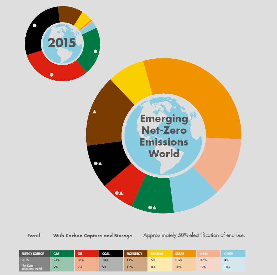 В 2016 г. Shell опубликовала один из своих энергетических сценариев "A Better Life with a Healthy Planet: Pathways to Net-Zero Emissions". Как следует из его названия, речь идет о том, что надо сделать для достижения нулевого уровня выбросов, и возможно ли это вообще. Общий вывод, который делают эксперты Shell, — это возможно, но технически сложно. Для этого, в частности, нужно, чтобы на э/э приходилось не менее половины конечного потребления энергии. Это потребует радикальных изменений в структуре производства и потребления энергии: по данным Международного Энергетического Агентства, в 2015 г. на э/э пришлось почти 19% от конечного потребления энергии. Остальные 81% — это нефтепродукты, природный газ, уголь и биомасса. Чтобы сценарий Shell стал реальностью, необходимо, среди прочего, чтобы мощности по производству э/э росли ежегодно на 800-1100 ТВтч.