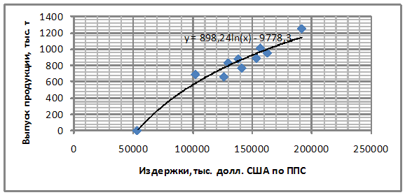 На рисунке приведен график производственной функции шахты "Южнодонбасская № 1" (годовые издержки исчислены в $ по паритету покупательной способности).