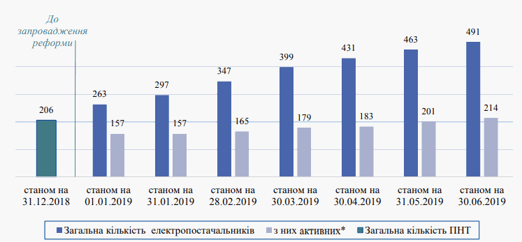 С 1 января 2019 г. розничный сегмент рынка электрической энергии был либерализован, т.е. деятельность по распределению электрической энергии была отделена от деятельности по поставкам. Из облэнерго выделили поставляющие компании, работающие в соответствующих регионах. Кроме того, появилось много других поставщиков. Только за II кв. 92 компании получили лицензии на право осуществления хозяйственной деятельности по поставке электроэнергии потребителю. Таким образом, количество компаний, продающих (или поставляющих для своих предприятий) электроэнергию в несколько раз превысило число бывших облэнерго. При этом более половины новосозданных поставщиков лицензии получили, но фактически электроэнергию не поставляли. По данным НКРЭКУ, активными на розничном рынке электрической энергии в апреле 2019 г. были 42% поставщиков, в мае — 43%, в июне — 44%. 1 января 2019 г., когда был запущен новый рынок э/э, начали свою работу почти 60 новосозданных компаний, следующие полгода их число увеличивалось на 30-40 в месяц. Число активных компаний росло значительно медленнее, и к середине года достигло 214.