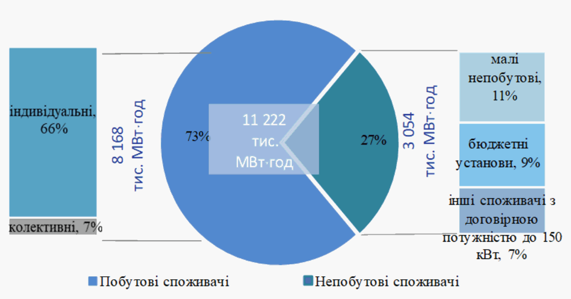 В отчете отражена структура потребителей универсальной услуги, и она вряд ли как-то изменилась за это время. Всего за II кв. 2019 г. объем потребления в этом сегменте составил 11222 тыс МВтч э/э на общую сумму около 15.6 млрд грн. Из этого объема 8168 тыс МВтч, или 73% пришлось на бытовых потребителей, 3054, или 27% — на небытовых. В сегменте бытовых потребителей 91% пришлось на индивидуальных и 9% — на коллективных потребителей. В сегменте небытовых потребителей 39% пришлось на малых небытовых потребителей, 35% — на бюджетные учреждения, 26% — на других потребителей с договорной мощностью до 150 кВт.